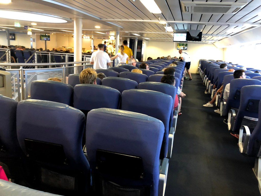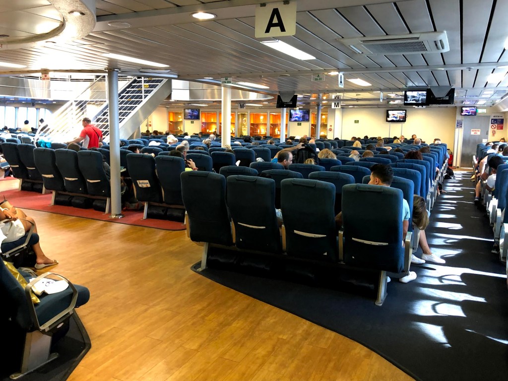 Just like with the Blue Star ferry, we had to board through the car garage. After someone checked our tickets, we climbed up a set of stairs and found ourselves at the front of the Silver class cabin.