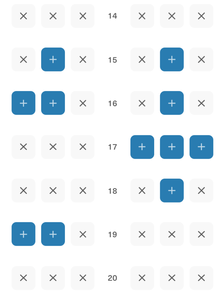 If you were a solo traveler selecting seats for this flight, you may be tempted to select window seats in row 16 or 19 hoping for an empty middle, or even one of the seats in row 17, vying for the elusive full row of three seats.