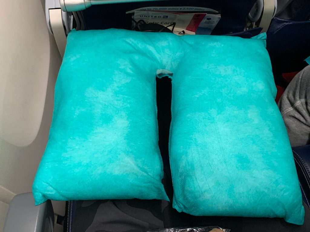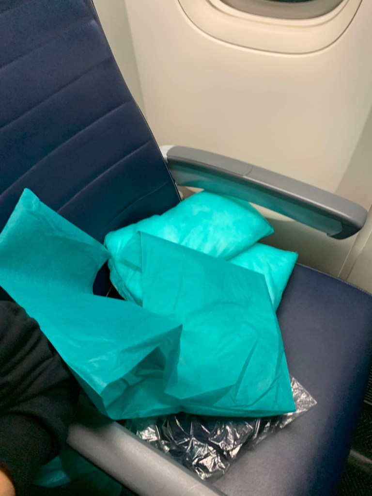 There was a pillow and blanket waiting on the seat. The pillow was shaped like a travel pillow but was a bit too flimsy for my liking. The blanket was light but comfy.