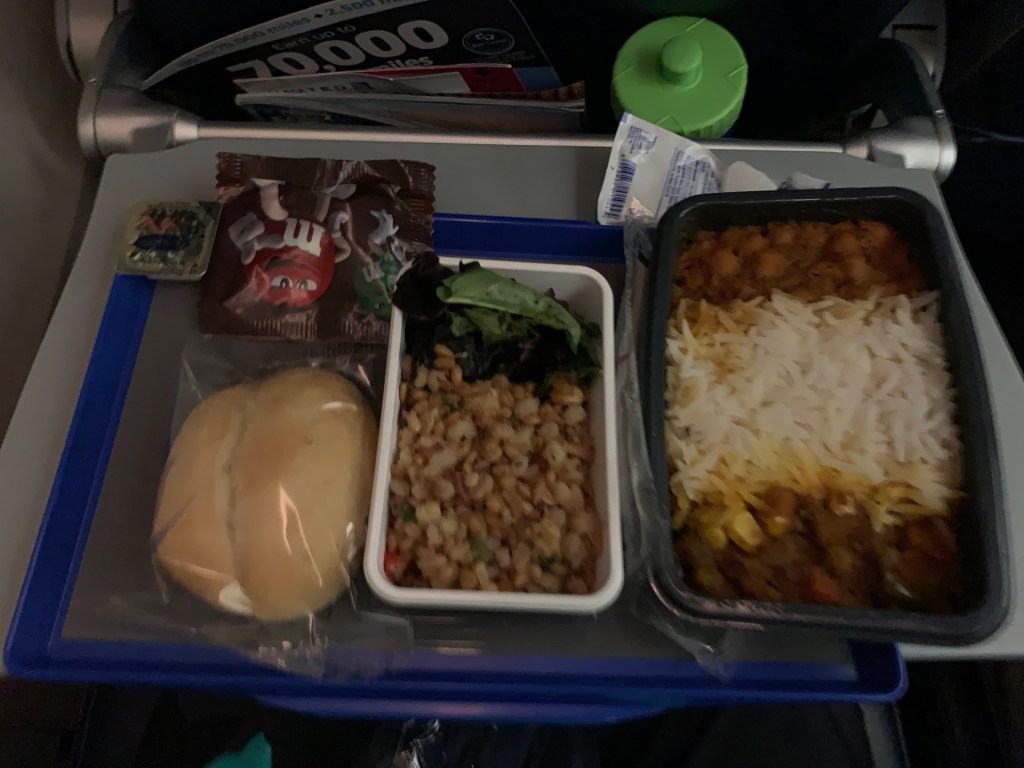 The dinner service began a little over 45 minutes after departure. There was a choice of a chicken or vegetarian dish. The meal was tiny, but I wasn’t hungry anyway. The hot portion was good, and even though the salad was bland, it tasted fresh enough.