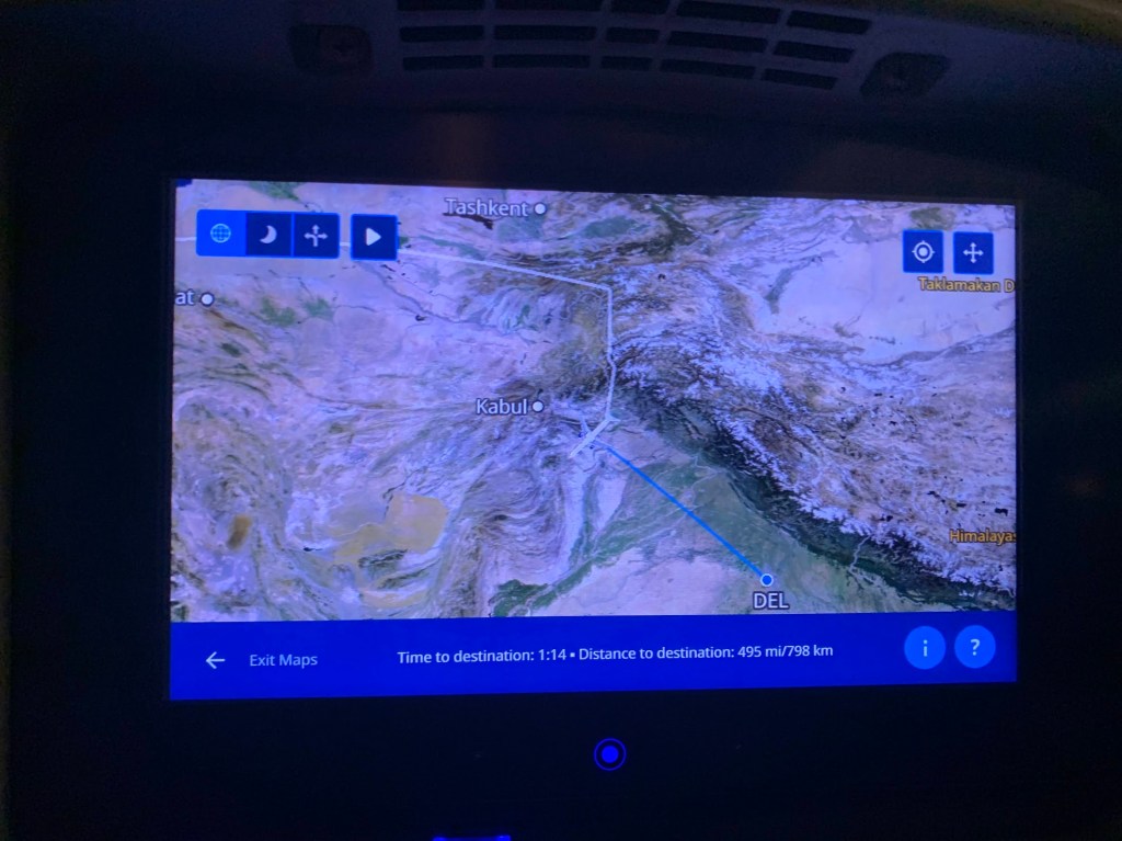 After passing Iran and Afghanistan from the north (since we weren’t allowed to fly over the vast majority of either nation), we made a 90 degree right turn to fly through the one permitted airway over Afghanistan, on its eastern sliver, which would take us through the country for only a few dozen miles and a few minutes. The turbulence at this point was insane. Luckily, however, it didn’t last too long after clearing the Himalayas.