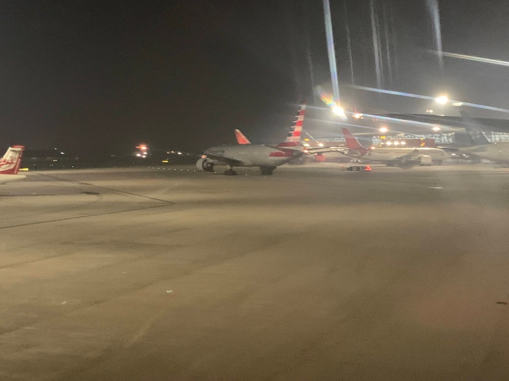 American 777 about to fly to New York (as well as some Air India widebodies in the background, mostly preparing to fly to North America and Europe)